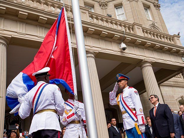 Estados Unidos y Cuba reanudaron este lunes sus relaciones diplomáticas y la bandera cubana volvió a ondear en su embajada en Washington, un histórico gesto que puso fin a décadas de hostilidades entre los dos vecinos, aunque aún resta un largo camino para que normalicen sus lazos.Tres militares marcharon por la puerta de la embajada e izaron el estandarte cubano -rojo, blanco y azul con una estrella solitaria, acompañados de los acordes del himno cubano.