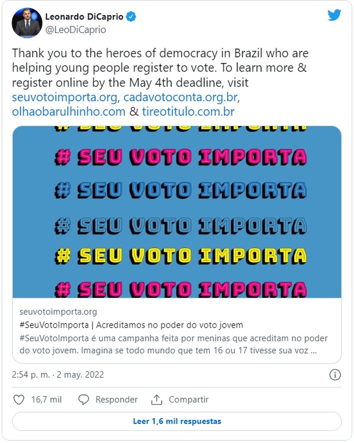 El 29 de abril, DiCaprio hizo una publicación en Twitter pidiendo a los jóvenes brasileños que regularicen su título de elector para votar en las próximas elecciones presidenciales, ya que el futuro de la Amazonía estaría en juego, en alusión a una posible victoria de Bolsonaro.