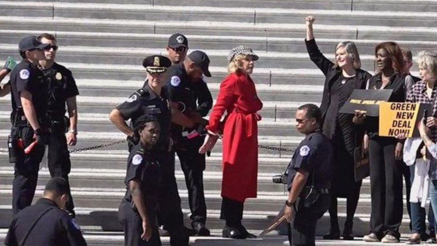 La actriz Jane Fonda fue arrestada este viernes en las escalinatas del Congreso de los Estados Unidos junto con un grupo de manifestantes que reclamaban decisiones del gobierno para contrarrestar el cambio climático.