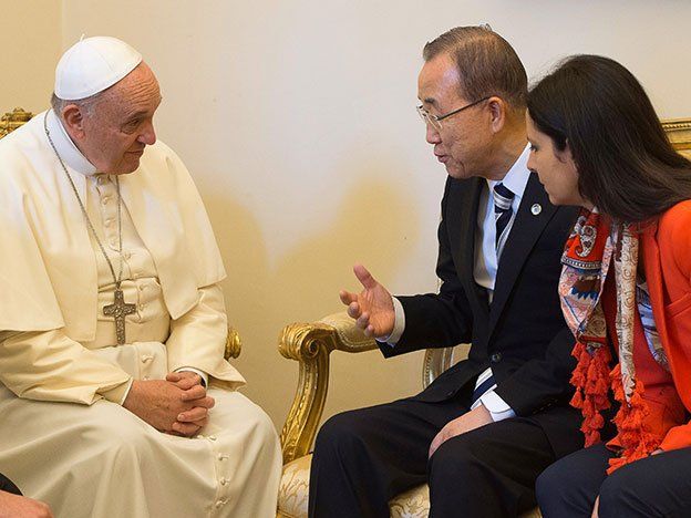 Ante líderes religiosos de diversas confesiones y altos cargos del Vaticano, Ban dijo que hay un gran consenso entre líderes religiosos y científicos sobre que el cambio climático es real, que los humanos deben cambiar su comportamiento para detenerlo y que "proteger nuestro medio ambiente es un urgente imperativo moral y nuestro deber sagrado para personas de todas las personas de fe y conciencia".
