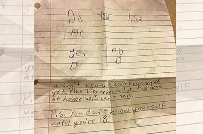 Cuando una niña de once años envía una nota al chico que le gusta, no se espera una respuesta como ésta. Su sencilla pregunta: “¿Te gusto?” con dos opciones para elegir una –‘Sí o No’- recibió una inesperada y larga respuesta que ahora se ha hecho viral con miles de comentarios en Reddit.