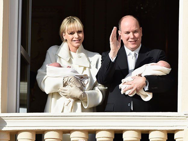 Los príncipes Charlene y Alberto aparecieron en el balcón del palacio, sosteniendo cada uno a uno de los mellizos vestido de blanco. El heredero, el príncipe Jacques, y su hermana mayor —por dos minutos— Gabriella fueron recibidos por una marea de banderas pancartas rojas y blancas.