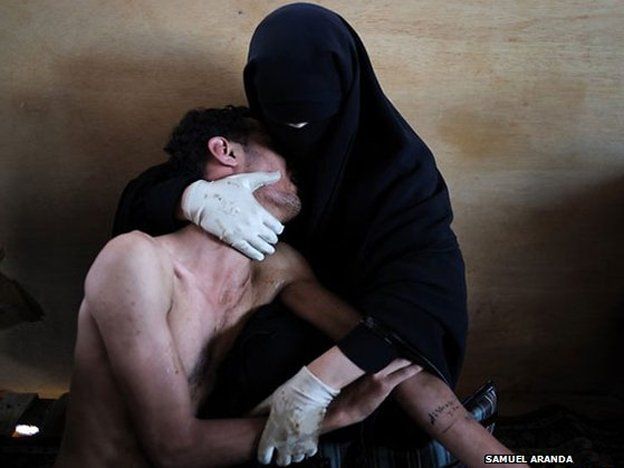 Su nombre es Fatima al Qaws y aparece en la fotografía con su hijo, Zayed, quien había sido herido mientras participaba en una protesta antigubernamental en Sanaa, la capital de Yemen.