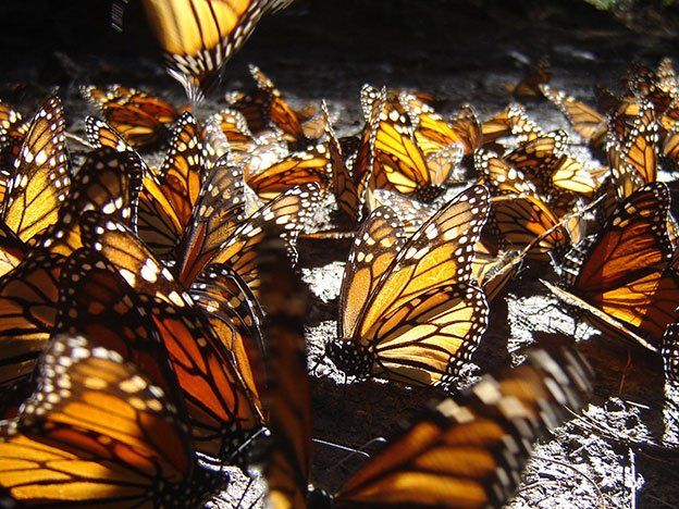 El clima templado de las montañas al oeste de la ciudad de México crea un entorno perfecto para las monarcas. Cada otoño, decenas de millones de ejemplares de esta criatura delicada vuelan miles de kilómetros agrupadas en nubes hasta los mismos lugares en los que se alimentaron generaciones precedentes de la especie. Una vez allí, se agrupan en las ramas de los árboles formando enjambres que van del negro al naranja.