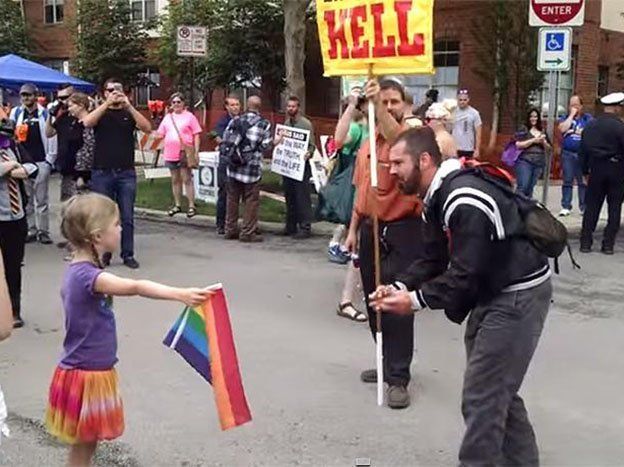 Acompañado por un individuo que portaba un letrero en el que se leía "Jesús salva del infierno", el hombre se dedicó a lanzar mensajes religiosos en contra de los gays y lesbianas, dirigidos a los asistentes a la celebración.Lo que no esperaba el predicador es que fuera una niña de siete años la que le plantara cara a cara por sus comentarios, que fueron calificados de "homofóbicos" por los presentes.