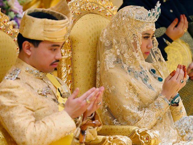 El Príncipe Abdul Malik de Brunéi contrajo matrimonio con Dayangku Raabi'atul' Adawiyyah Pengiran Haji Bolkiah este fin de semana, celebrando una de las bodas más fastuosas del año. Los novios, él de 31 años y ella de 22, vistieron trajes de oroadornados con diamantes y piedras preciosas.El ramo de la novia estaba hecho con gemas en lugar de flores y usó zapatos del diseñador francés, Christian Louboutin, con cristales encrustados y una tobillera de oro macizo. También lució un colgante de diamantes y esmeraldas.Abdul Malik es hijo de Hassanal Bolkiah, Sultán de Brunéi, un «magnate» del petróleo y gas, considerado como uno de los hombres más ricos del mundo. El Sultán tiene cinco hijos y siete hijas fruto de tres matrimonios.
