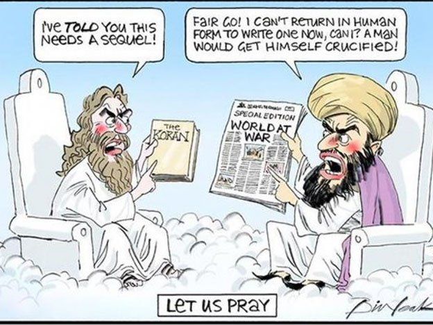 El dibujo, titulado "Oremos", fue publicado por el periódico The Weekend Australian y muestra a Jesús con el Corán en la mano que le dice a Mahoma "Ya te he dicho que necesita una segunda parte", en referencia a que la Biblia tiene un Antiguo y un Nuevo Testamento.