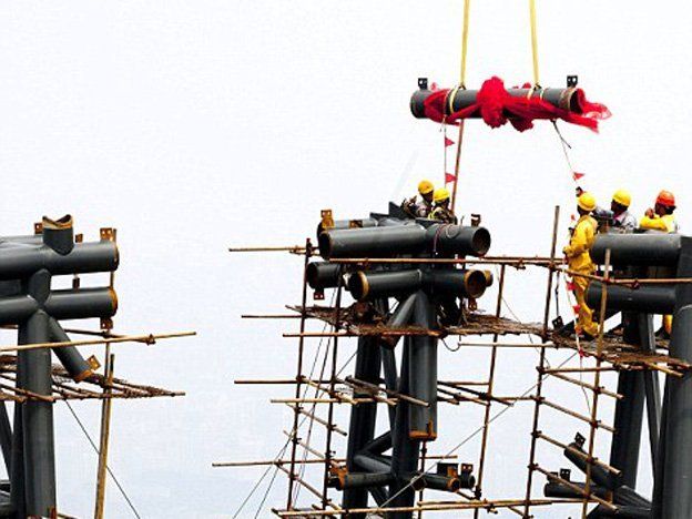 “La última viga (de acero) en forma de aleta de la estructura de la cumbre de la torre fue alzada lentamente con ayuda de una grúa y colocada en el lugar”, anunció la constructora.