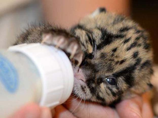 El cachorro de leopardo nublado, una especie originaria de Taiwán, pertenece al Lowry Park Zoo ubicado en Florida, Estados Unidos.Durante la grabación que fue publicada en Facebook se puede observar al pequeño felino mientras toma leche de una mamadera y es bañado con agua tibia por su veterinaria.