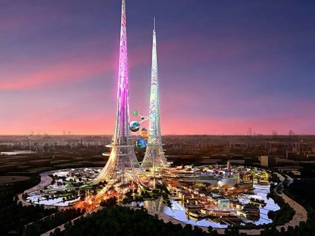 Diseñadas para ubicarse en una isla en un lago, la más grande de las torres será de 172 metros (564 pies) más alta que Burj Khalifa en Dubai.