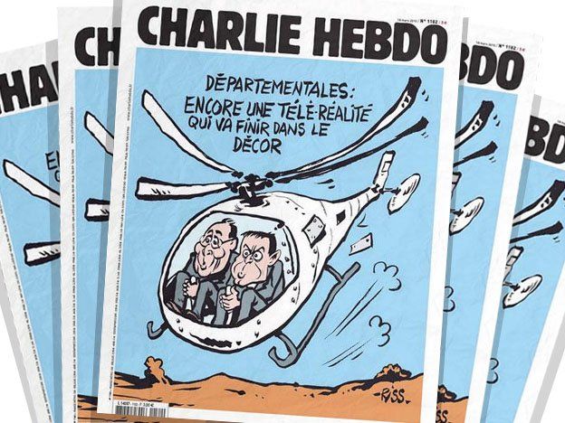La revista satírica, que fue noticia a escala mundial tras el atentado sufrido en enero, puso en tapa un helicóptero piloteado por el presidente francés, Fracois Hollande, y su primer ministro, Manuel Valls, en el que saltan partes y que está a punto de estrellarse, justo a cinco días para las elecciones provinciales en Francia.