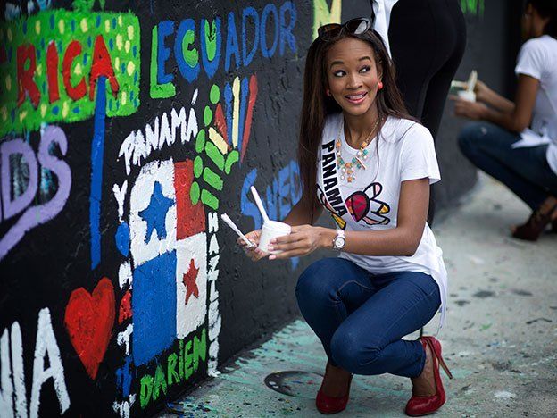 Todas las candidatas dejaron ver su talento artístico y, con pincel en mano, contribuyeron a la creación de un mural en el que plasmaron las banderas, el nombre de su país y le dieron color a la fachada del estudio del artista en Miami.
