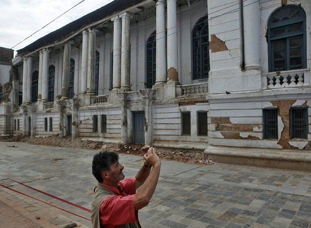 La foto del día. Un turista fotografía un edificio dañado cerca de la plaza Basantapur Durbar, de Katmandú, Nepal.
