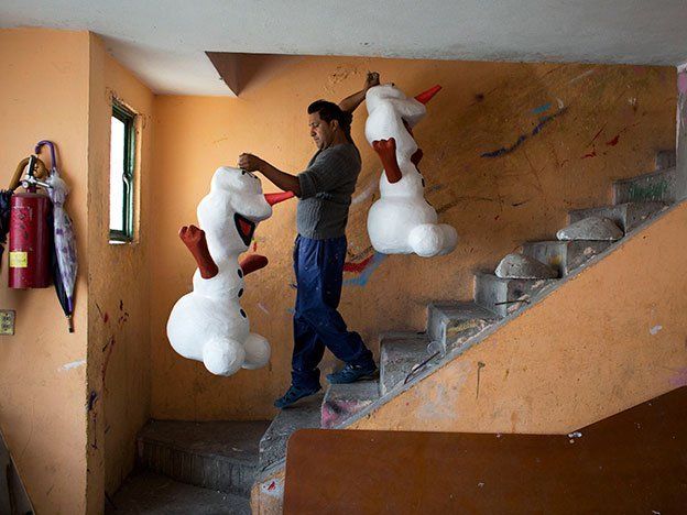 En el edificio de cuatro plantas ubicado en una colina al este de la Ciudad de México, la pareja hace piñatas de cartón con las imágenes de personajes como Mickey Mouse a ser usadas en los cumpleaños de niños o caricaturas de políticos a ser vapuleadas en manifestaciones de protesta.