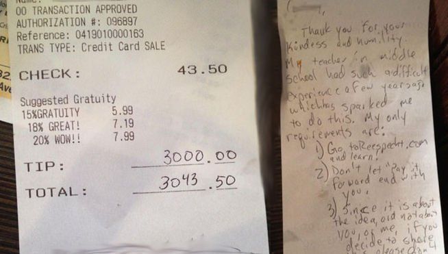 Al parecer este cliente anónimo decidió dejar esa propina para una camarera que tenía problemas para pagar el alquiler y que estaba a punto de ser desalojada.