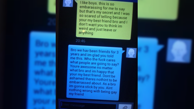 "Me gustan los muchachos, esto es vergonzoso para mi pero es mi secreto y me da tanto miedo decirlo porque sos mi mejor amigo, mi hermano y no quiero que creas que soy raro y me abandones o algo".
