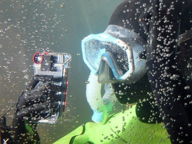 El video muestra cómo otra persona se sumerge y alcanza el celular. Lo toma y sube hasta la superficie para entregárselo al aliviado turista.