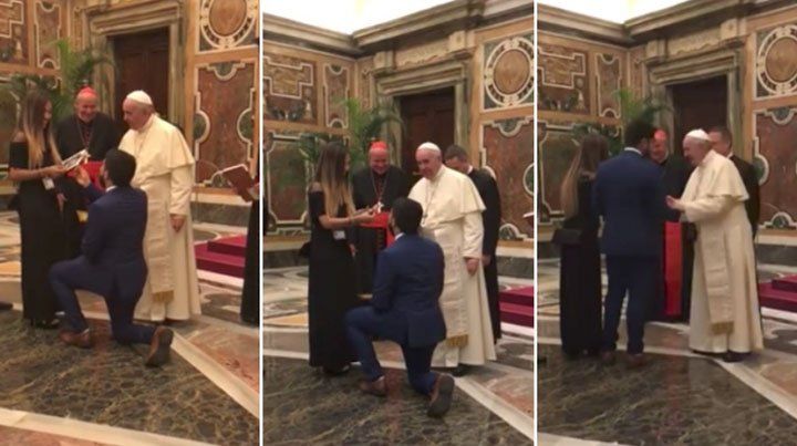 Durante el tradicional saludo al papa en la imponente Sala Clementina, dentro del palacio apostólico, el joven diputado y su novia conversaron unos minutos con el papa y de repente se arrodilló para pedirle la mano a su prometida, lo que sorprendió a todos los presentes.