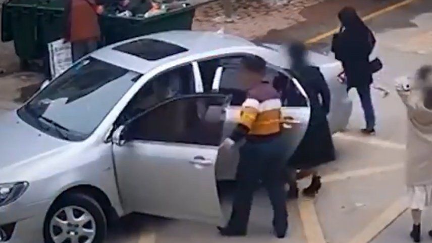 En la imagen se puede ver como el conductor totalmente ebrio, toma el control del volante a partir de ese momento se lleva por delante tachos de basura, incluso hasta casi lleva por delante a su propia hija que se había bajado junto con su madre.
