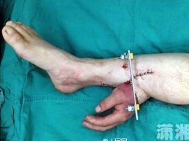 El doctor Tang Juyu, jefe de microcirugía del hospital, decidió operarle e injertarle la mano amputada en el pie para que los tejidos se regeneraran, y volver a colocársela en el brazo tiempo después.