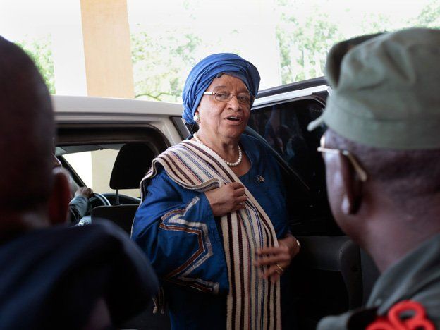 "No es una coincidencia que el ébola azote a tres estados frágiles —Liberia, Guinea y Sierra Leona— todos en dificultades para superar las secuelas de guerras interconectadas", declaró la gobernante de Liberia.