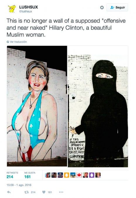 Las autoridades se pusieron en contacto con el dueño del local de venta de motos para pedirle que eliminara el dibujo. Sin embargo, el artista, conocido como Lushsux, en lugar de eliminarlo optó por cubrir el cuerpo de Clinton con un burka, que sólo dejaba ver los ojos de la candidata demócrata. Junto a su grafiti escribió un mensaje: "Si esta mujer musulmana te ofende, eres un intolerante, racista y sexista islamófobo".