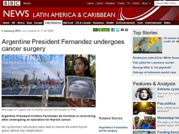 Medios de habla inglesa como BBC News hacen hincapié en la operación de la Presidenta y relatan que “militantes de Cristina Fernández hacen vigilia en las afueras del hospital en el que se encuentra la mandataria para ser intervenida por un cáncer en la glándula tiroides”. El mismo medio destaca además que “los médicos informaron que la mandataria tiene buenas posibilidades de recuperación”