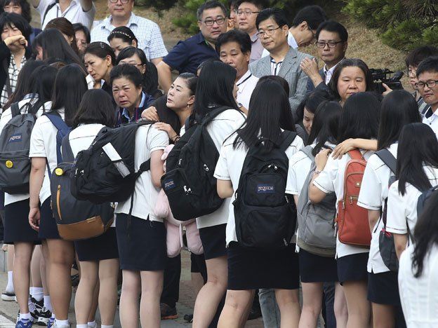 La ira, el dolor y el profundo remordimiento en la Escuela Secundaria Danwon en Ansan, en las afueras de Seúl, es un reflejo de lo que muchos surcoreanos han sentido desde que el 16 de abril el hundimiento dejará más de 300 muertos o desaparecidos. De los 325 estudiantes que realizaban un viaje de estudios a la turística isla de Jeju, 75 fueron rescatados, 245 murieron y 5 siguen desaparecidos. Dos de los rescatados ya regresaron a la escuela, dijeron las autoridades.