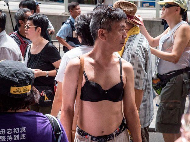 Olvidate de los paraguas: el último símbolo de protesta en Hong Kong es el sostén.Así se manifestaron decenas de ciudadanos el domingo en contra de lo que dicen es una decisión absurda y sexista: la condena de un manifestante de tres meses y medio de cárcel por "agredir a un agente de la policía" con su pecho.