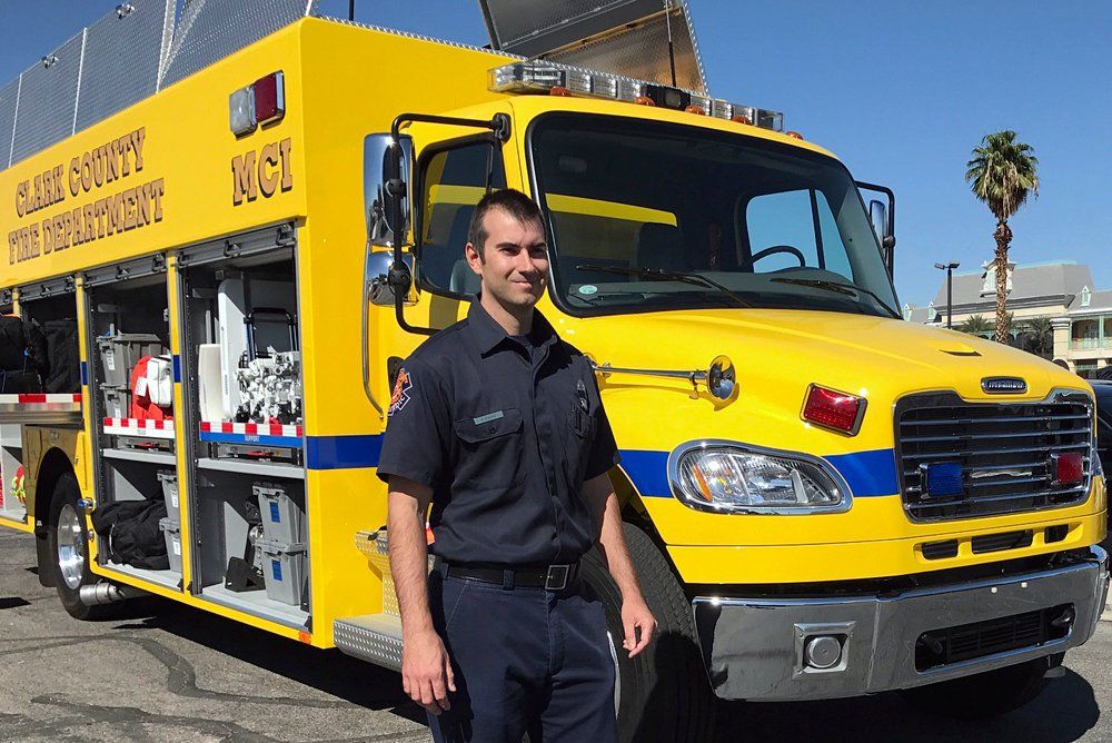 El conductor de bomberos Brian Emery estaba manejando el camión de su estación de regreso de un accidente menor cuando centenares de personas histéricas rodearon su vehículo cerca de un concierto al aire libre en Las Vegas, Nevada, Estados Unidos.