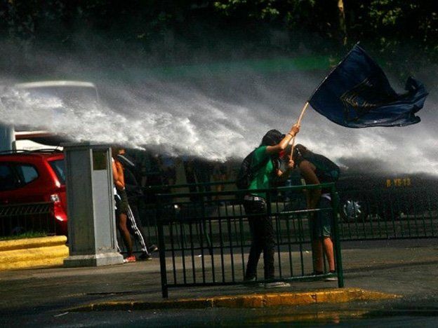 Los incidentes comenzaron a las afueras de la Universidad de Santiago, en el centro de la capital chilena, donde cientos de encapuchados que intentaban bloquear la emblemática avenida Alameda fueron dispersados con gases lacrimógenos lanzados por la policía, constató un periodista de la AFP.