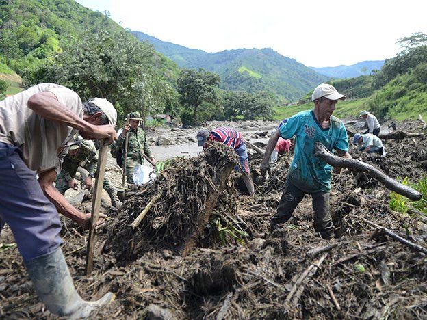 La tragedia de Salgar —a 265 kilómetros al noroeste de Bogotá— parece ser el incidente con más muertos desde 1999, cuando un terremoto causó centenares de fallecidos en la ciudad de Armenia. Una oleada de inundaciones durante la temporada de lluvias de 2011 cobró más de 100 vidas.Sobrevivientes en Salgar contaron cómo se despertaron tras un fuerte estruendo y por los gritos de los vecinos. Muchos apenas pudieron reunir a sus seres queridos y salir del paso del torrente de piedras y lodo que destrozó casas y puentes en la quebrada la Liboriana."La avalancha arrasó con todo", contó Diego Agudelo, que trabaja como albañil. Añadió que el río se llevó por delante parte de su vivienda.Decenas de rescatistas respaldados por helicópteros Black Hawk evacuaron el lunes a residentes próximos a la quebrada por temor a otro deslave. Un camión de bomberos fue visto llevándose a varios cuerpos cuyos pies descalzos colgaban de un maletero abierto.El presidente Juan Manuel Santos, que viajó a la localidad para supervisar las labores de rescate, indicó que varios niños perdieron a sus padres en la tragedia y que los cuerpos de los fallecidos tenían que ser trasladados a Medellín para su identificación.El mandatario prometió reconstruir las viviendas perdidas y proporcionar refugio y asistencia a las más de 300 personas que se habrían visto afectadas por el alud."Aprovechemos esta circunstancia tan triste para sacar esa fortaleza que ustedes tienen, ese temple, y a la larga salir mejor como lo estábamos antes", observó Santos.La inundación destrozó parte del acueducto del pueblo. Autoridades proporcionaron agua, alimentos y mantas para ayudar a los residentes a sobrellevar lo que describieron como una emergencia humanitaria.La accidentada orografía de Colombia, ubicada en una zona con actividad sísmica en el extremo norte de los Andes, combinada con la mala calidad de las construcciones, hace de la nación una de las más propensas a los desastres en Latinoamérica.Más de 150 catástrofes han sacudido el país en los últimos 40 años, cobrándose más de 32.000 vidas y afectando a más de 12 millones de personas, según el Banco Interamericano de Desarrollo.Luz María Urrego, de 74 años, dijo que se libró de morir porque había viajado a Medellín para el largo fin de semana de feriados. Su hermano murió junto a sus hijos y nietos, agregó."Le dije a mi esposa 'abracémonos y esperemos que Dios nos salve''', dijo el residente Jorge Quintero a la televisión RCN. Describió cómo quedó atrapado entre dos Corrientes que se llevaron por delante dos viviendas a ambos lados de la suya. "Sé que Dios nos echó una mano porque aquí estamos, vivos, todavía con miedo, pero vivos".