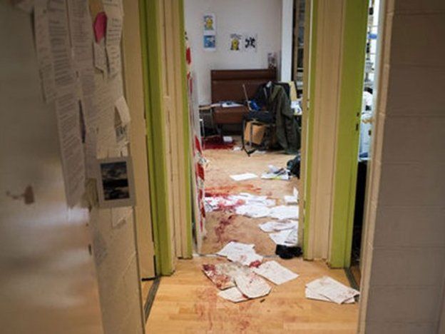 En la foto puede verse uno de los pasillos de la redacción con papeles en el suelo manchados con sangre.