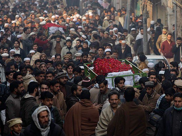 La masacre talibán que acabó el martes con 148 personas —la mayoría niños— en una escuela militar del noroeste de Pakistán dejó a su paso una escena de devastación y sangre, mientras el país lloraba el miércoles en funerales masivos por las víctimas y el gobierno readmitió la pena de muerte para delitos terroristas.