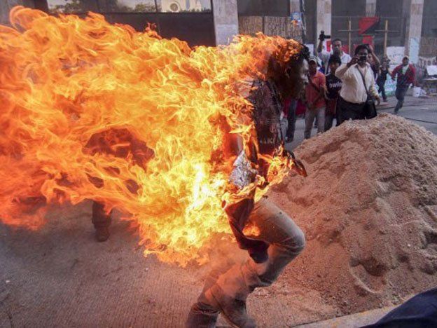 El sitio SDPnoticias informó que el manifestante Agustín Gómez Pérez se inmoló frente al Congreso de Chiapas. Por este acto presenta quemaduras de segundo grado en un 50 por ciento del cuerpo.