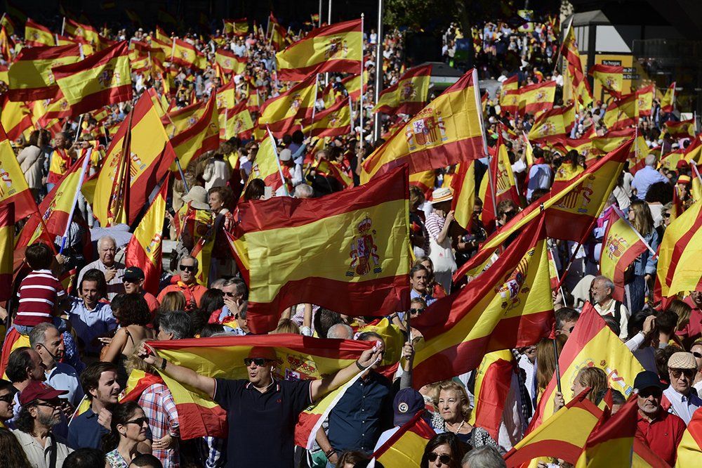 Bajo un mar de banderas españolas, unos 50.000 manifestantes en la Plaza Colón del centro de Madrid gritaban "¡Viva España!" y "unidad nacional" entre el sonido de tambores.