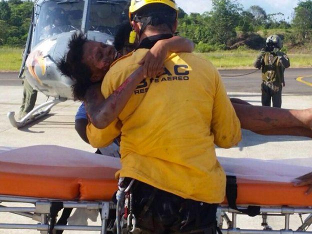 La selva hablaLa selva chocoana es uno de los lugares más hostiles de la geografía colombiana. Los árboles de hasta 60 metros de alto hicieron que llegar al lugar por el aire fuera difícil, según narró el mayor de la Fuerza Aérea Cristian Mejía, que operó el helicóptero en la primera misión de rescate.“Es una selva muy espesa”, explicó a CNN en Español.Sin embargo, los rescatistas no cesaron su labor porque empezaron a encontrar rastros que podrían indicar que aún quedaban esperanzas de encontrar vivos a la joven de 19 años y su pequeño bebé.Los oficiales hallaron pedazos de coco, piezas de un celular y el registro civil del niño.Asisclo Rentería, integrante del grupo de rescate de la Cruz Roja Colombiana, fue quien encontró a la mujer en una búsqueda intensa en pleno corazón de la selva, a cinco días de iniciadas las labores.En conversación con CNN en Español, Rentería reconstruyó la odisea de la mujer luego del accidente del avión.Según el rescatista, María Nelly salió del avión y en un primer intento de pedir auxilio usó los dos celulares que el piloto llevaba, pero ninguno de los dos tenía señal.Entonces identificó un río muy cerca del lugar de la tragedia y emprendió su camino por el sendero para encontrar algún pescador que pudiera ayudarla. Pero antes cortó y comió unos cocos que traía en el avión. Luego se dirigió a un pozo de agua que había a 10 metros del lugar y bebió un poco de agua.Durante el fatídico vuelo, la mujer había visto el río desde el aire y pensó que si lo seguía podría encontrar ayuda, según le contó el rescatista a CNN en Español.Pero no tuvo éxito. Con poca comida para ella y para su bebé, decidió acampar en la espesa selva chocoana, por lo que construyó un ‘cambuche’ artesanal para proteger al pequeño de las inclemencias climáticas.El encuentroAsisclo Rentería llegó el pasado miércoles al lugar donde habían hallado el cuerpo del piloto. Con ayuda de tres habitantes de la zona emprendió una minuciosa evaluación del terreno.Cuando encontró los objetos que había dejado la mujer a su paso, siguió su rastro como un sabueso.Una rama partida y la huella de un resbalón en suelo selvático fueron la pista final para ubicarla. Entonces, ocurrió el milagro: sólo siete metros de diferencia los separaban y cuando se encontraron la mujer dio un grito pidiendo ayuda.– "Tranquila que es la Cruz Roja colombiana, estése ahí quieta que ya la vamos a ayudar", respondió Rentería al llamado de la mujer.El rescatista llamó al resto de su equipo para que le brindaran los primeros auxilios médicos a María Nelly y le dio un poco de comida para mitigar los estragos de cinco días a punta de agua. Asisclo Rentería (izquierda) rescató a María Nelly y al bebé. (Crédito: Cortesía FAC) La mujer fue rescatada con quemaduras de segundo y tercer grado en su cuerpo y una cortada en la planta del pie, producto del accidente días atrás.El bebé resultó milagrosamente ileso, únicamente con molestias en sus piernas producto del roce del pantalón y la humedad del clima, según el relato de Rentería.Madre e hijo fueron trasladados a un centro de salud en la ciudad de Quibdó donde reciben atención médica.