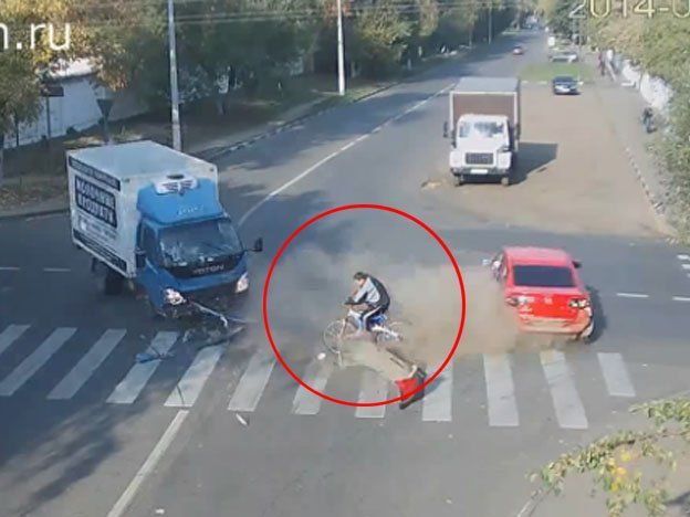Un impresionante choque en las calles de Rusia entre un camión y un auto no le provocó lesiones severas a ninguno de los conductores. Pero, un ciclista que se encontró con el accidente pasó entre los dos vehículos salvando su vida milagrosamente.