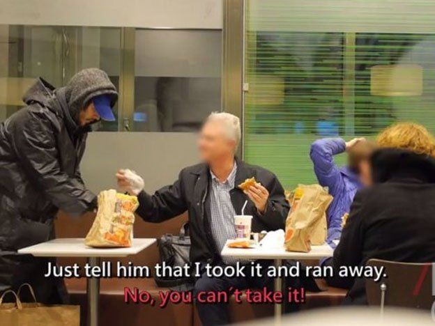 El staff de NormelTV hizo un curioso video: un hombre compró un combo en una casa de comidas rápidas y le pidió a los que estaban al lado que lo cuidaran mientras iba al baño. En ese momento, apareció un indigente diciéndoles que tenía mucho hambre.