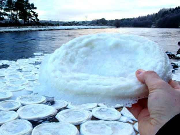 Tortillas de hielo. Estos "extraños" objetos helados fueron encontrados durante una reciente ola de frío cerca del río Dee, una vía fluvial llena de salmones .