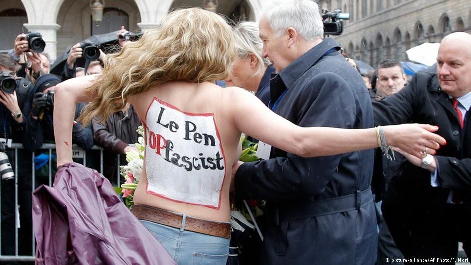 Tres militantes del movimiento Femen, con los pechos desnudos y con el saludo "Heil Le Pen" pintado en el torso, perturbaron el viernes un discurso de Marine Le Pen, la líder del partido francés de ultraderecha Frente Nacional.La tres militantes, ubicadas en un balcón de un edificio del barrio de la Opera, cerca del estrado donde Marine Le Pen hablaba en ocasión del 1 de Mayo, hicieron el saludo nazi y gritaron consignas contra el Frente Nacional antes de ser desalojadas por la policía.