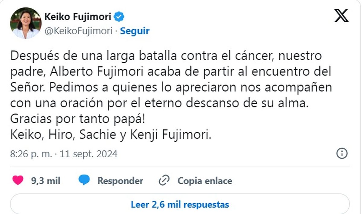 La noticia fue confirmada por su hija, Keiko Fujimori, a través de sus redes sociales. "Después de una larga batalla contra el cáncer, nuestro padre, Alberto Fujimori acaba de partir al encuentro del Señor. Pedimos a quienes lo apreciaron nos acompañen con una oración por el eterno descanso de su alma. Gracias por tanto papá!", expresó la política peruana en la red social X.