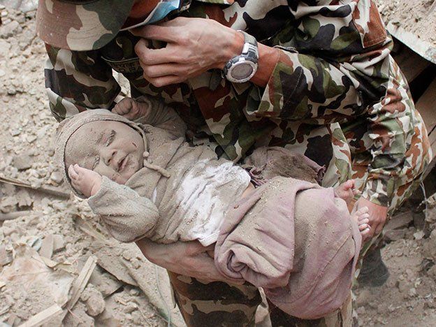 El fotógrafo nepalí Amul Thapa sonrió y dejó atrás por un momento la tristeza cuando vio la escena que siempre recordará: rescatistas sacaban de entre los escombros de su casa donde quedó atrapado por 20 horas a un niño de cuatro meses.