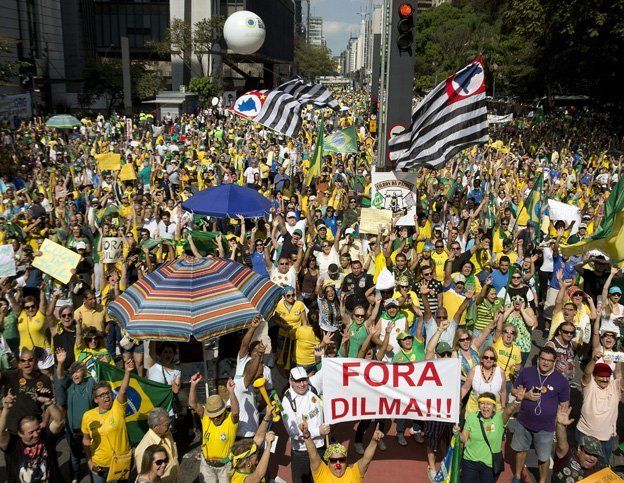 Millones de manifestantes lamentan la debacle de la economía brasileña, que según todo pronóstico cerrará el año en recesión y ha puesto en riesgo el sello de buen pagador de ese país –su grado de inversión bajó al último escalón de las agencias de calificación–.Con Dilma Rousseff debilitada –tiene el menor apoyo a un jefe de Estado desde el fin de la dictadura militar hace 30 años–, algunos legisladores agitaron el fantasma del impeachment, que requiere la aprobación de dos tercios de la Cámara de Diputados y un proceso especial en el Senado.