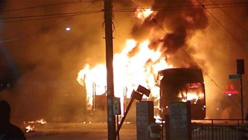 Durante la madrugada al menos cinco buses del Transantiago fueron incendiados en diferentes barrios, y en la comuna de San Ramón desconocidos bajaron al conductor para mover la máquina lo que derivó en un atropello, la muerte de un manifestante y el linchamiento del que conducía el vehículo.