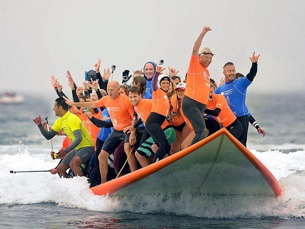 Sesenta y seis personas establecieron el sábado un récord mundial al mayor número de personas subidas al mismo tiempo a una tabla de surf.Campeones de surf y astros locales fueron algunos de los que se sumaron a una tabla construida a medida de 42 pies (12 metros) en la playa de Huntington.