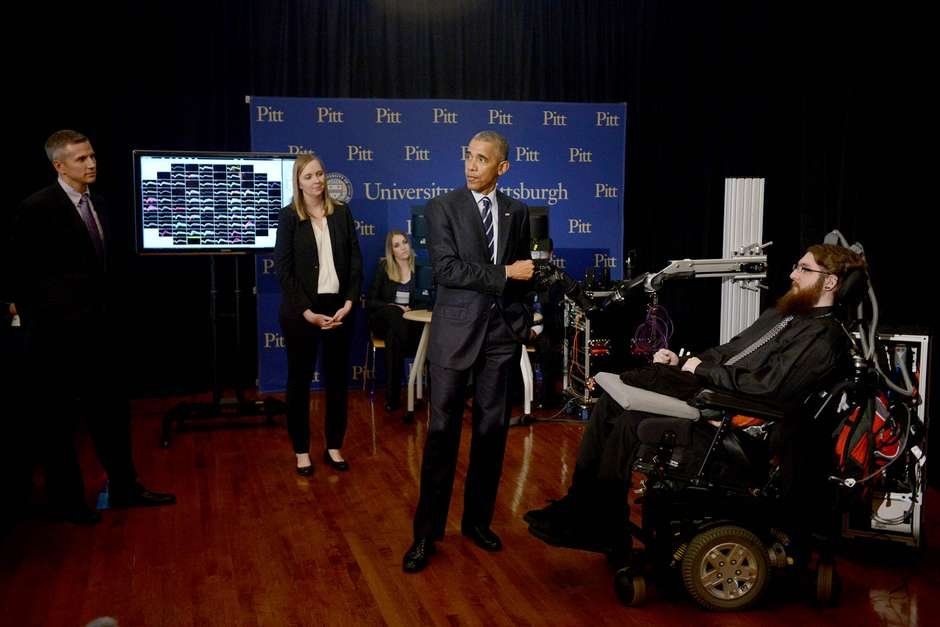 El presidente felicitó a los investigadores de la Universidad de Pittsburgh que están desarrollando la tecnología. El proyecto es parte de los esfuerzos para crear extremidades artificiales que puedan sentir.