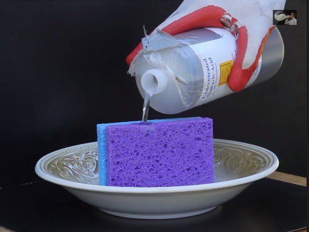 Como detalle extra, la celulosa de la que está compuesta la esponja obedece a la fórmula C6H10O5. Dicho de otro modo 6 carbonos unidos al equivalente de 5 moléculas de agua (H2O multiplicado por 5). La avidez del ácido sulfúrico es tan alta que es capaz de romper el enlace con los átomos de carbono y donar un protón al agua resultante, que a su vez reacciona con el sulfúrico que continua cayendo.