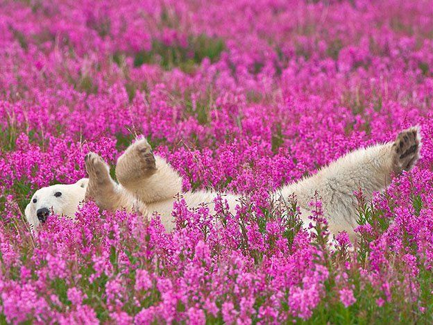 Raramente se ven osos polares fuera de su medio ambiente ártico, pero eso no significa que no les guste divertirse en verano.En esta serie de raras imágenes del fotógrafo canadiense Dennis Fast, estos gigantes blancos aparecen jugando en un campo de flores.
