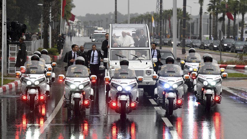Llovió a lo largo del trayecto, y el papa llegó protegido a bordo de su papamóvil, mientras que Mohamed VI viajó en una limusina descapotable, ataviado con la tradicional jellaba marroquí.
